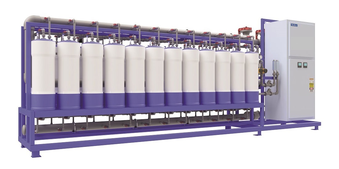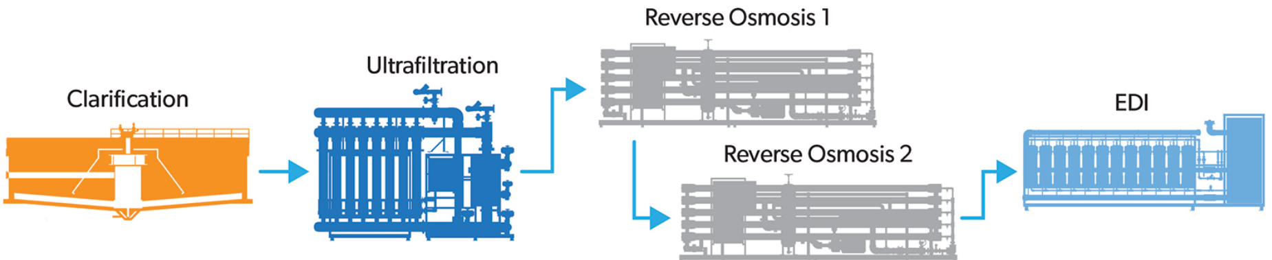 Electro deionization (EDI) is a continuous process that utilizes an applied current to remove ionized and ionizable species from a water source while continuously regenerating the ion exchange media. Ions are transferred to concentrate chambers by the use of cationic and anionic semi-permeable membranes and flushed out of the module through a continuous waste stream. Dilute product water moves through the dilute chamber and out of the module. An on-skid rectifier will apply a voltage to remove dissolved impurities. EDI is used for high purity and ultrapure applications, including boiler feed makeup water, where required product resistivity is ≥ 5MΩ. EDI typically follows a single or double pass reverse osmosis system (RO). Electro deionization EDI Flow Diagram ability to provide EDI pre-treatment including clarification, ultrafiltration, and reverse osmosis ensures that all parts of the system will work seamlessly together.